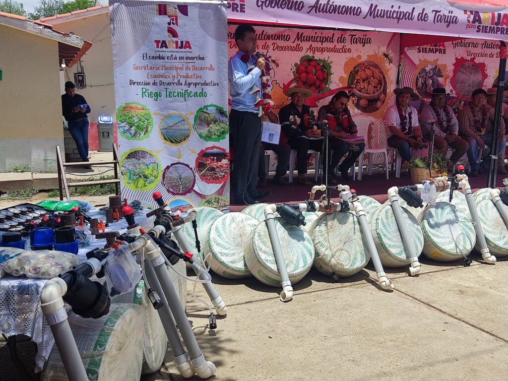 Para garantizar la producción y mejorar las condiciones de vida en el área rural, el alcalde de Tarija, Johnny Torres Terzo, realizó la entrega de materiales para la implementación de sistemas de riego tecnificado, aspersión o goteo, en beneficio de las familias productoras de las subcentrales de Tolomosa y Lazareto.