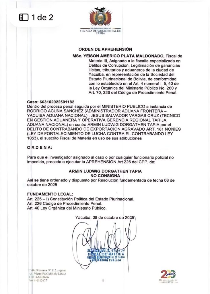Según la información disponible, esta orden responde a una denuncia presentada por la Aduana Nacional, y no guarda relación con el caso Botrading, que se investiga en La Paz y en el que Dorgathen también figura como implicado.