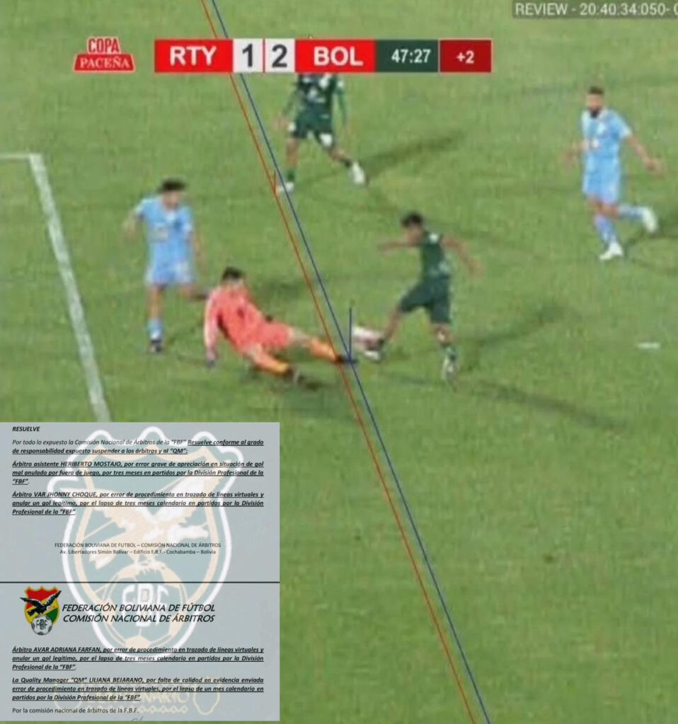 Los árbitros VAR Jhonny Choque y Adriana Farfán recibieron la misma sanción. Ambos fueron señalados por “errores de procedimiento en el trazado de líneas virtuales”, lo que llevó a anular indebidamente el tanto de Mario Barbery, jugador de Tomayapo.