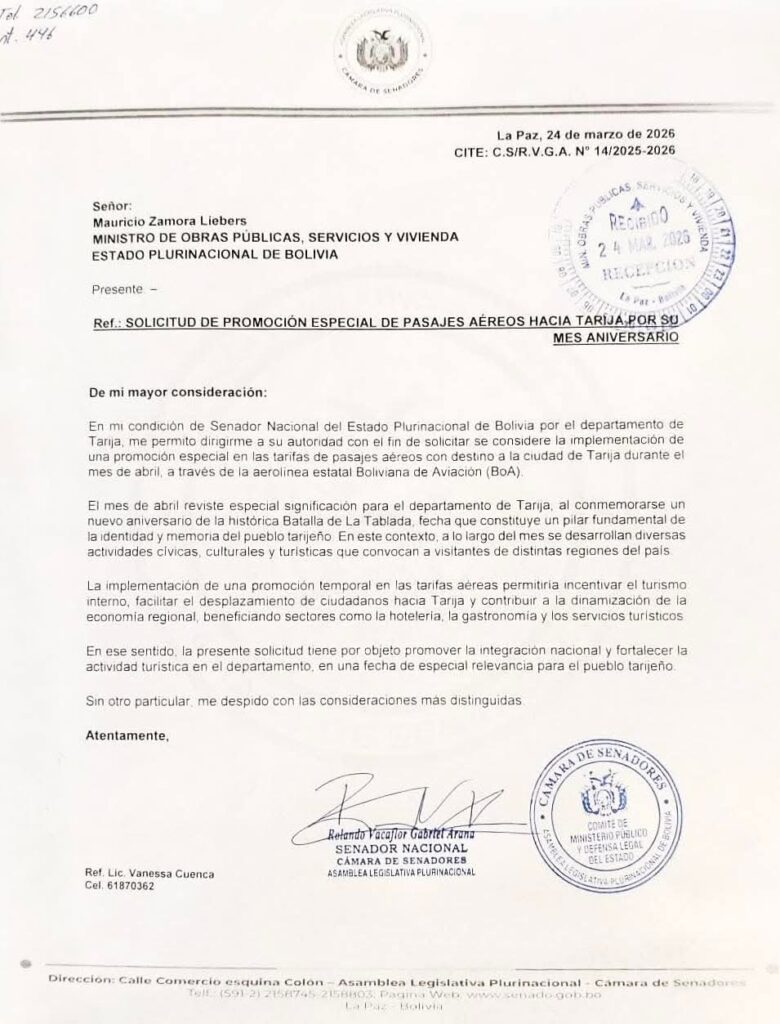 La solicitud enfatiza que la promoción especial de pasajes contribuiría a consolidar la actividad turística en el departamento y a reforzar el valor histórico y cultural de Tarija en el marco de su aniversario.