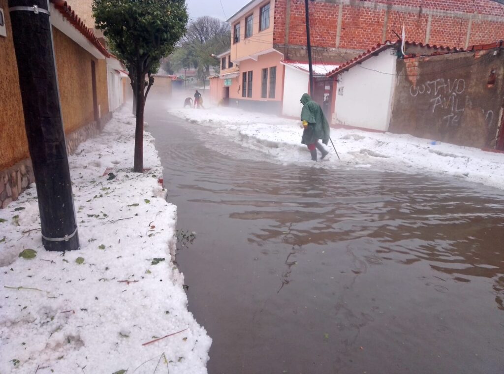 Durante aproximadamente 30 minutos, la lluvia torrencial acompañada de granizo cubrió el centro urbano y zonas periféricas. En la calle Ballivián, frente al Crematorio del Cementerio General, varios automóviles quedaron inmovilizados por los bloques de hielo acumulados en la vía.